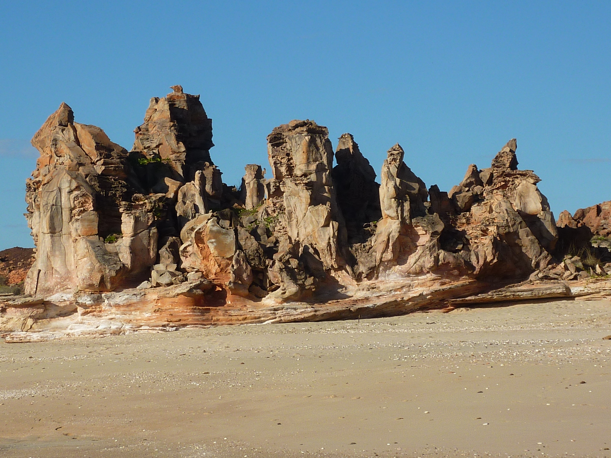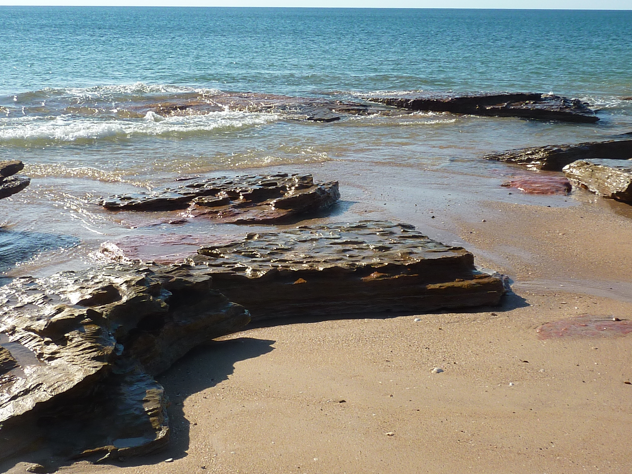 We’re about to set off down the beach for a walk, a swim, and to take some photos. The beach here is stunning with red cliffs against pale golden sands and clear, deep water. The sand’s firm and there’s lots of rock pools at low tide that make for interesting walks. Dotted here and there along the red cliffs are some impressive rock formations. It is a beautiful beach.