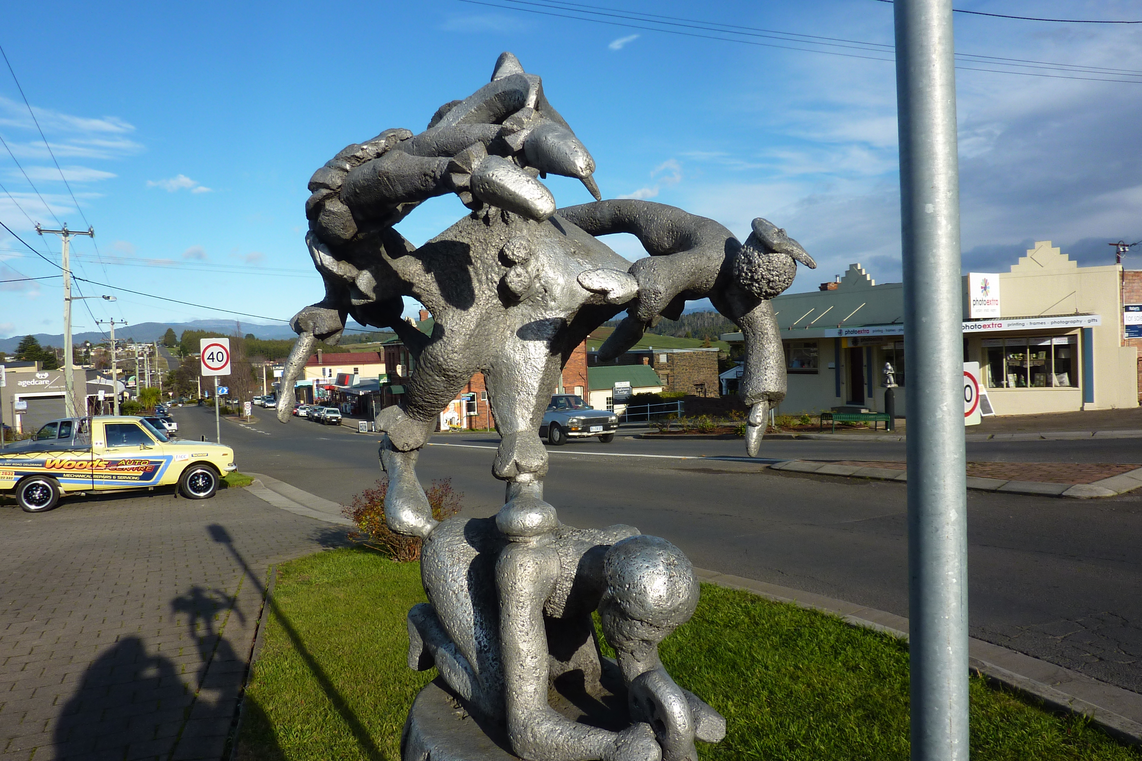 The street has lovely metal sculptures every couple of lamp posts apart. There must be at least three dozen in total and include guitar playing minstrels, circus troops, Tai-Chi, wood cutters etc. You name it, its probably represented in the sculptures on Deloraine’s main street.