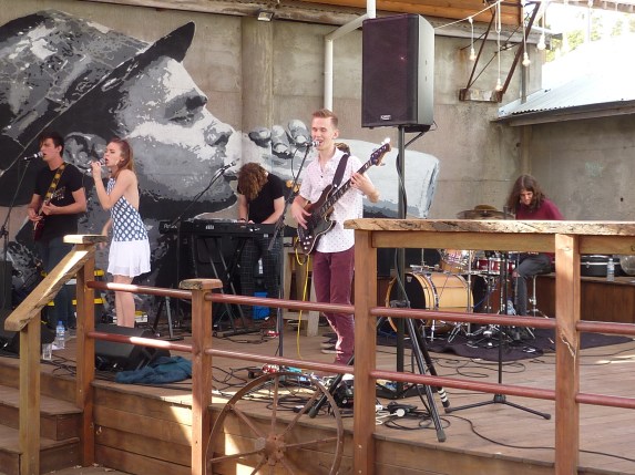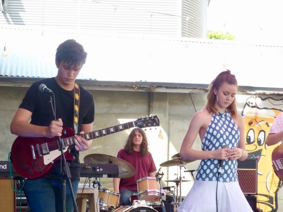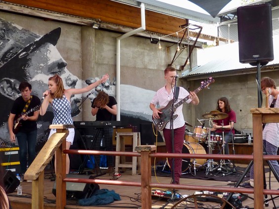 They only play their own original tracks. I tend to think that’s a bit of a shame when playing to an audience completely new to their sounds. Something familiar played well will always get ears tuned in the right direction immediately, whereas unfamiliar sounds always takes considerably longer to imprint into peoples consciousness. My thoughts are that if the first song is familiar and then another familiar song is thrown in every three or four songs when playing to a new audience it’ll get the crowds attention earlier, and keep their interest long enough for the band to showcase their own sounds. When it comes down to it though, I guess it’s not about achieving fame and fortune, it’s about a group of young people together having some fun. They’re certainly having a ball. It brings them a lot of pleasure to stay true to their own original material – so I guess why not.