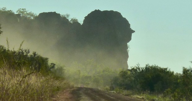 We awoke early, as one would expect after such an early night at Windjana, and lay in bed until it was light. Paul was getting to be a dab hand at dropping the tent by this stage, so after a quick cuppa and a bowl of yogurt and fruit, we were packed up and on our way.