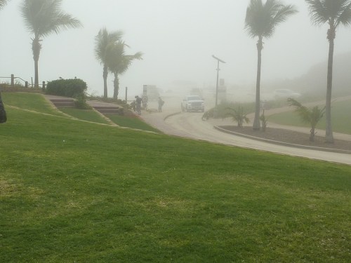 There wasn’t any rain, but the palm trees were thick with fog moisture, and dropping huge droplets of water similar to the drops that fall from the sky just as it’s about to open up with a torrential downpour. It was a bit distressing to see chairs and a podium set up under the palms awaiting a wedding party. What a day for it, what would be the chances eh!