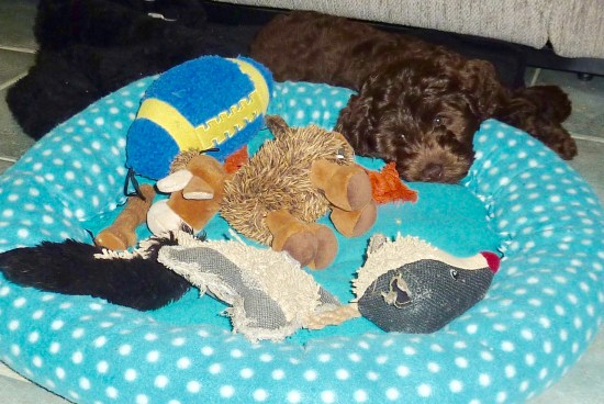 He loves his toys. He puts them in his bed, then takes them outside, then immediately brings them back in again and puts them back to bed. His night bed (inside his crate) is a bit bigger than this one, so more room for both him and his toys. I can see a bigger day bed is going to be needed soon.