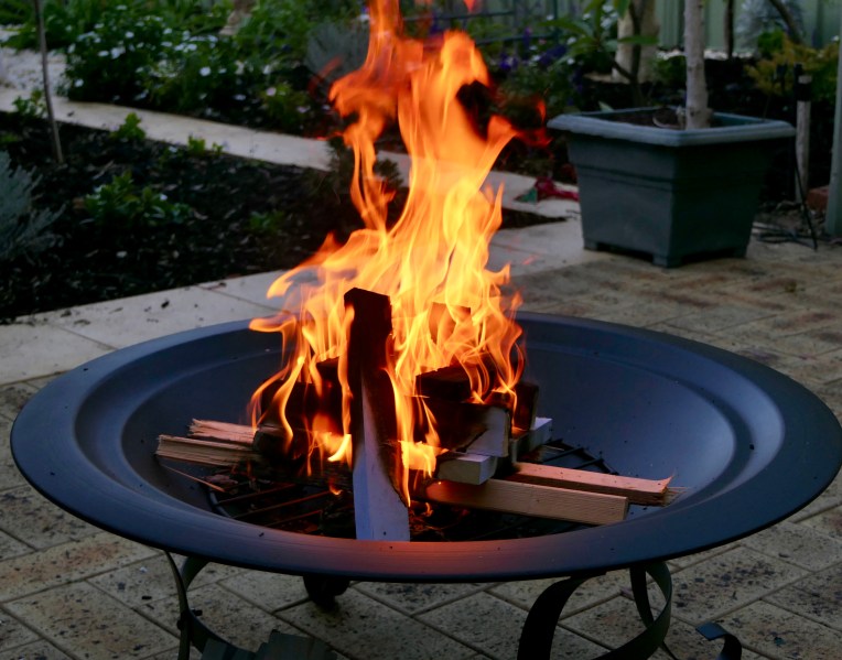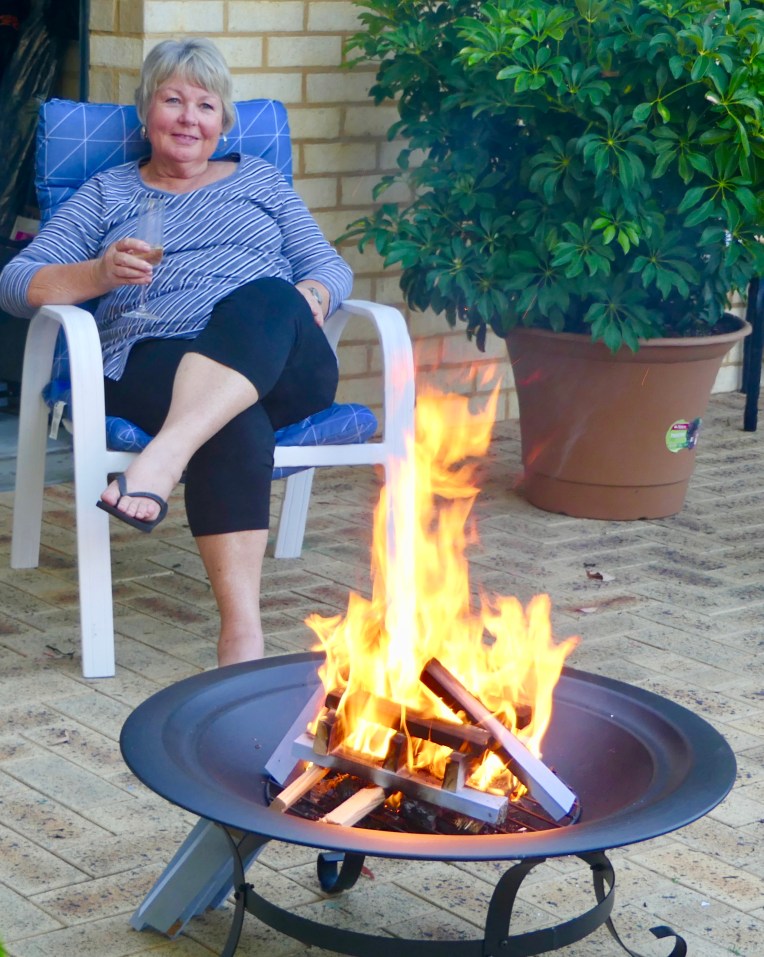 As the flames took hold a hose came over the fence – Our friend and neighbour had seen the smoke and decided he’d better come to the rescue…… LOL! Now Brian’s starting to get a bit of reputation with flames and fire (or perhaps he’s always had it) – so rather than risk him completely dousing our flames, we thought he and Kaye had better come over to share a glass of red and soak up the ambience with us.  Anyway, what’s better than sitting around a fire pit in your back yard? Having friends sitting around it with you of course!