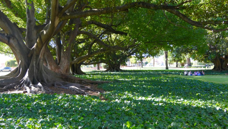 It’s an old fashioned style of city park with green lawns, flower gardens and lots of non-native trees including Jacarandas, Illawarra Flame Trees, willows, oaks, Plane trees, and huge wide-spreading, old Moreton Bay Fig Trees.
