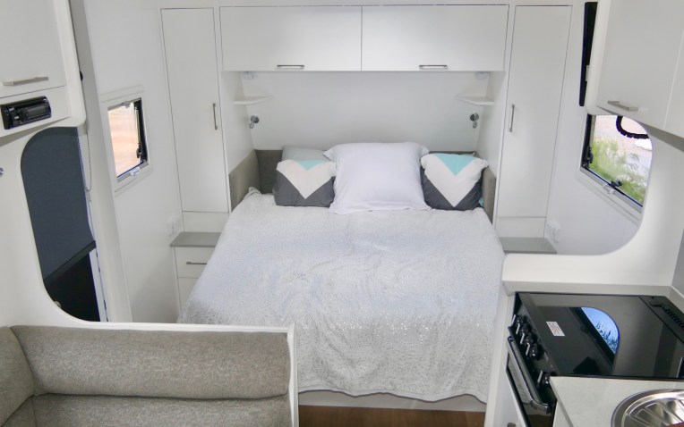 We chose all white for our interior cupboards (I think the salesman thought we were a bit boring). We like the way white makes everything look clean and bright, and we’ll fit mirrors to the wardrobe doors and cupboards above the bed so as to make it reflect light even more, and make it look bigger. Our last van was all white, and we never tired of it.