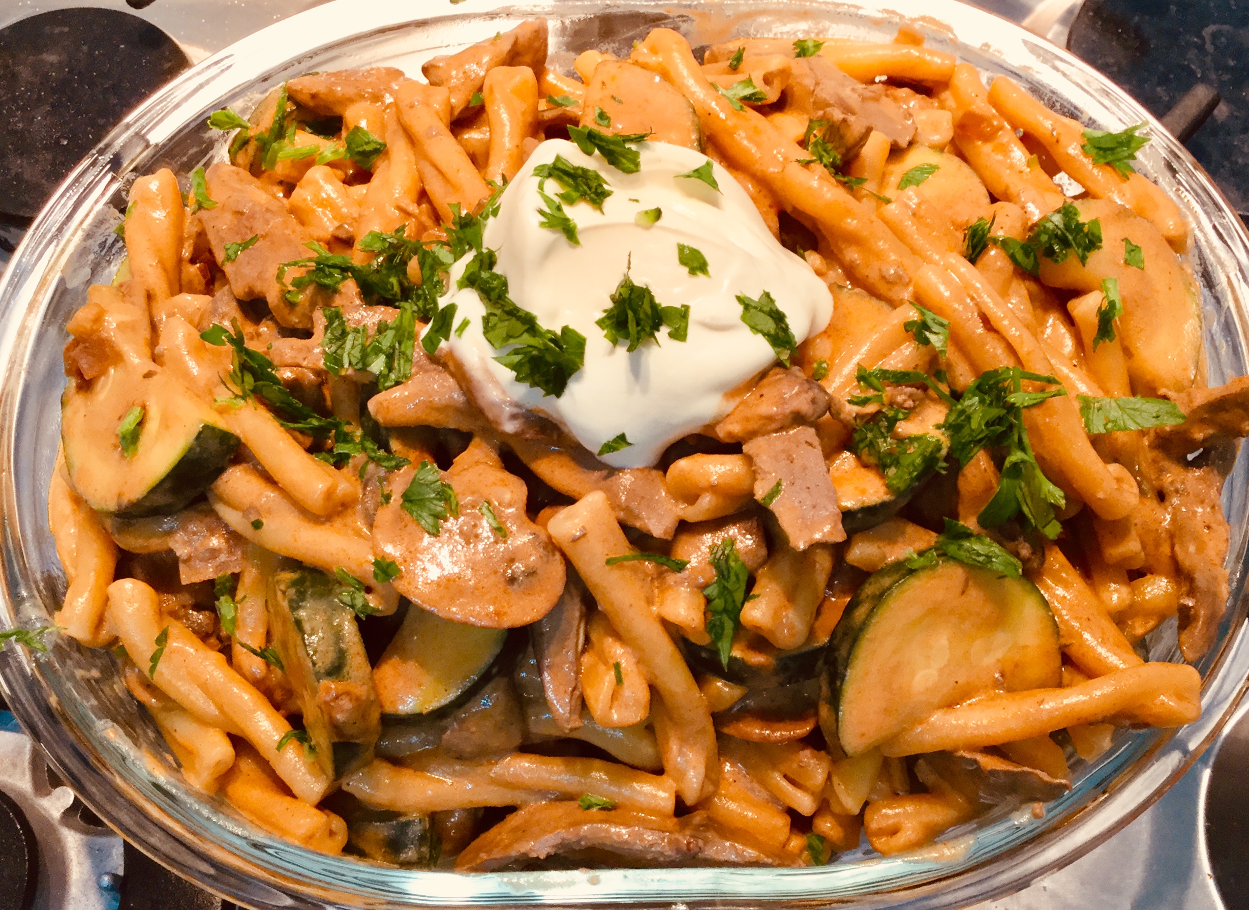 Once the pasta was strained I mixed the two together and garnished with a bit more sour cream and some chopped parsley.