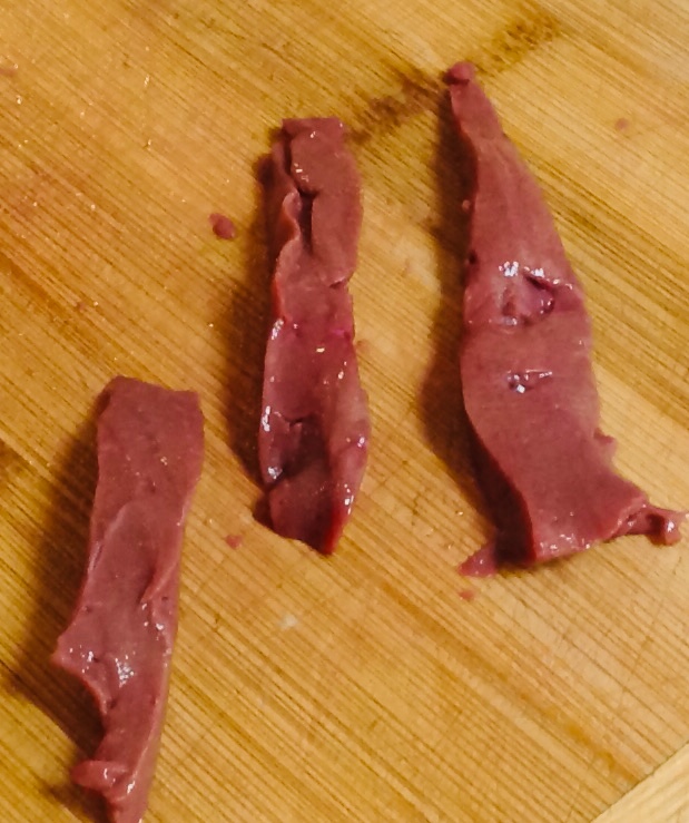 Now, how to cook it. Decide what sort of dish you want. If you want liver and bacon, leave the slices as they are. Tonight I was making a dish inspired by stroganoff, so I cut the thin slices further into thin strips. I’m not going to provide the recipe (mainly because I don’t cook to a recipe). But hopefully I’ll give you some ideas that you can other run with, or ideas that will inspire you to use liver in place of some other meat in a dish you are familiar with.