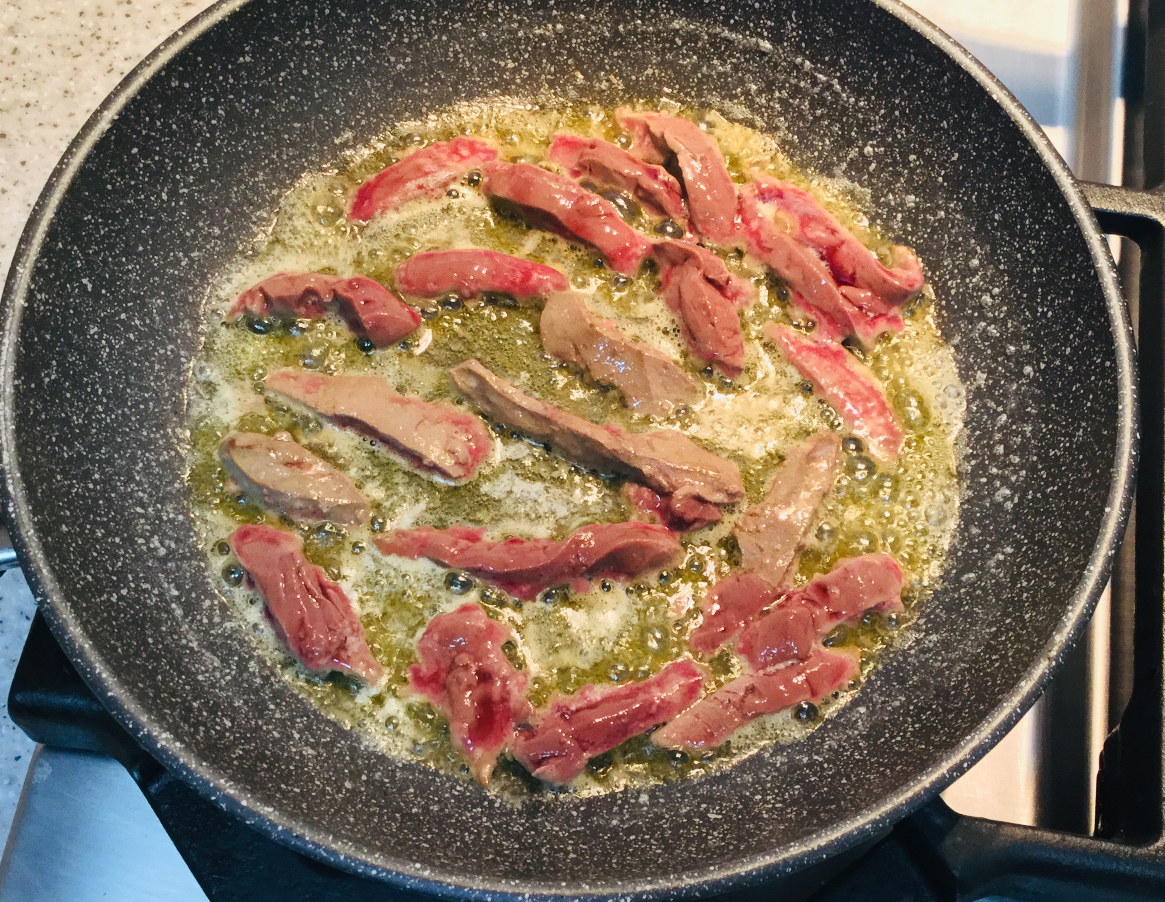 Now you need to cook it very quickly. It’s for this reason that I never flour it as it increases the time it takes to cook, and if it’s cooked even a minute to long you’ll risk it becoming tough. Heat some butter and olive oil in a fry pan until it’s hot and foamy, and then add either the thin slices of liver, or stripes of liver depending what you’re planning to do with it when cooked. Only put a few slices in the fry pan at once, turn them almost immediately and remove. It should still be rare. Cook in small batches and pile onto a plate for it to rest. The heat will continue the cooking process while you now turn your attention to rest of the dish.