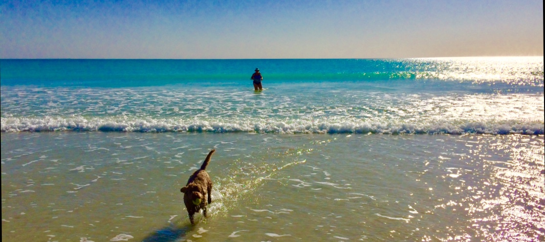 High tide was around 1.30 – 2pm each day, so the best time for us to drive onto the beach was around 2 hours after high tide. We spent the days relaxing, and taking turns to swim in the pool while one of us stayed with Mr Tilly. Mid afternoon, with the tide receding, we drove some way down Cable Beach where we tossed the ball for Tills, and enjoyed some beach time ourselves. Tills is getting good at judging the waves, and loves bounding into the surf between the small breakers to retrieve his ball. He doesn’t swim out of his depth yet, but clearly he loves the water.