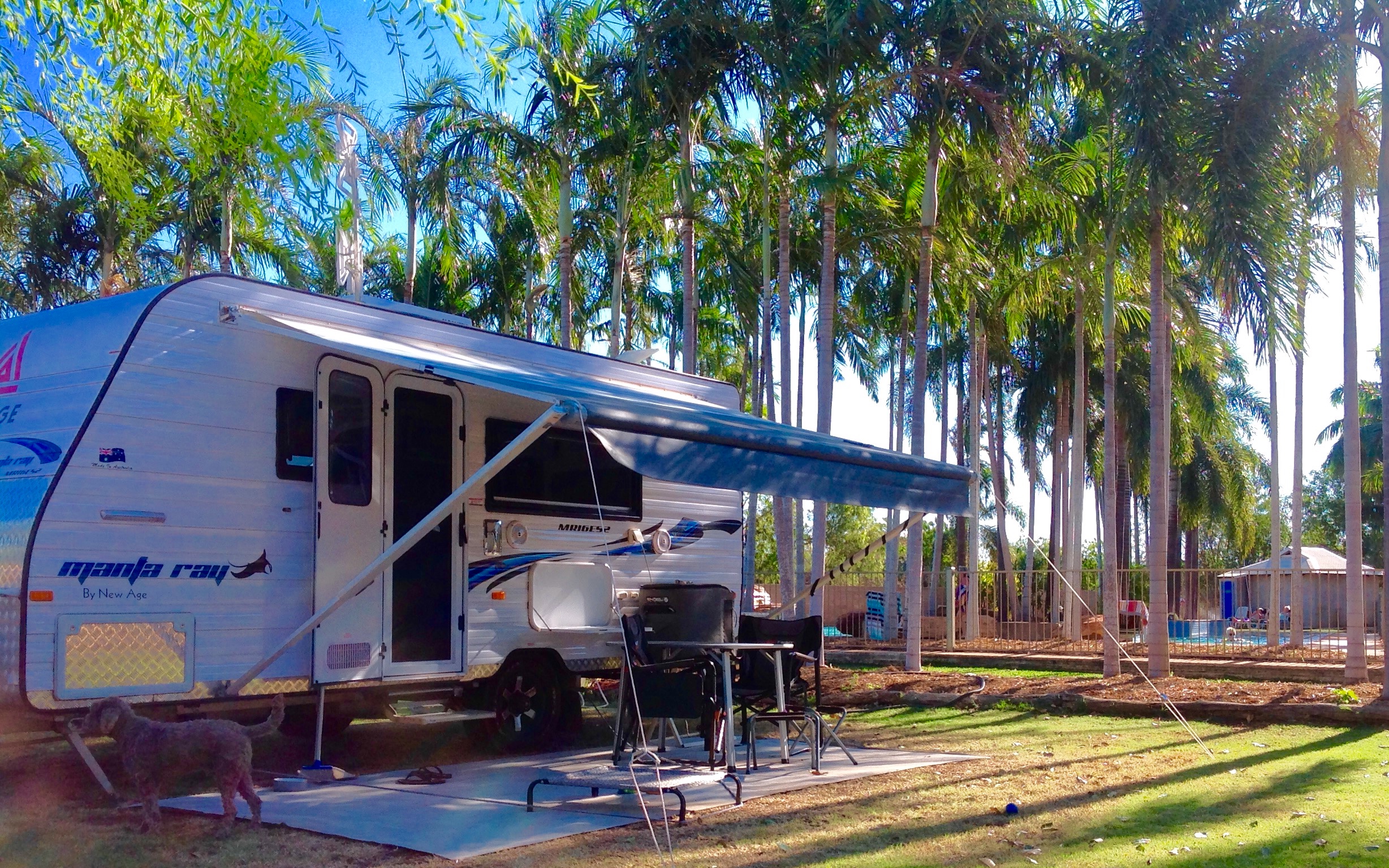 We arrived into dog friendly Broome Caravan Park around 2pm, and were offered what must surely be one of the best sites in the park. Our site was a large grassed site fringed with palm trees and backing onto the big lagoon style pool. It’s a short walk to the ablutions, and very close to a gas barbecue. A passer by stopped to chat to us and commented that our site had to be, ‘the ducks nuts’.