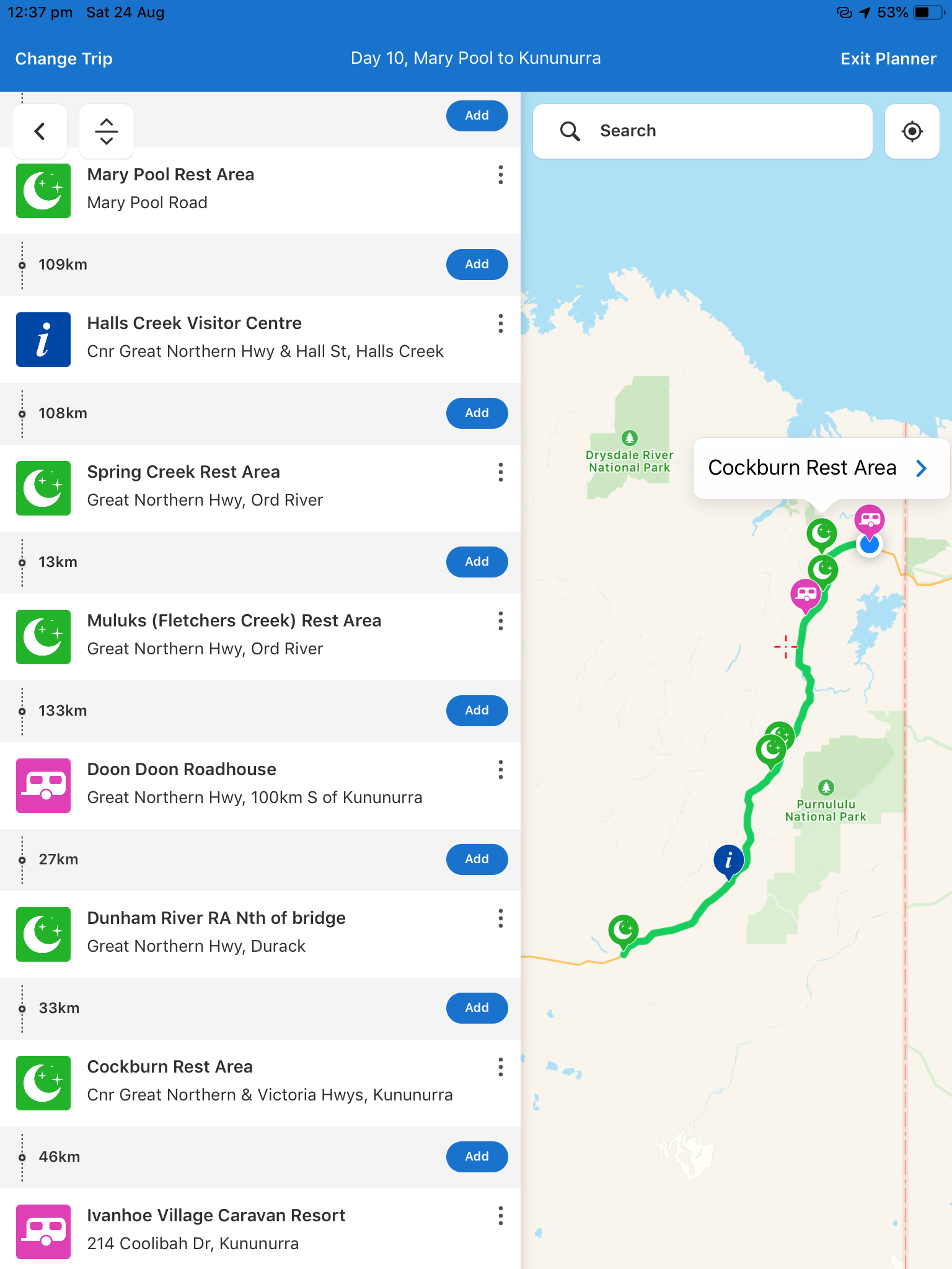 The map shows the town of Halls Creek, our first fuel stop. Then a couple of rest areas. We hadn’t planned on stopping at Muluk’s for breakfast, but roadworks earlier in the trip had made it difficult to find the entrance for Spring Creek. We stopped again for fuel at Doon Doon, and considered staying the night there. We had planned to take a look and see if we wanted to stay, or continue on a bit further to one of the free campsites. However, a phone call while at Doon Doon changed our plans.