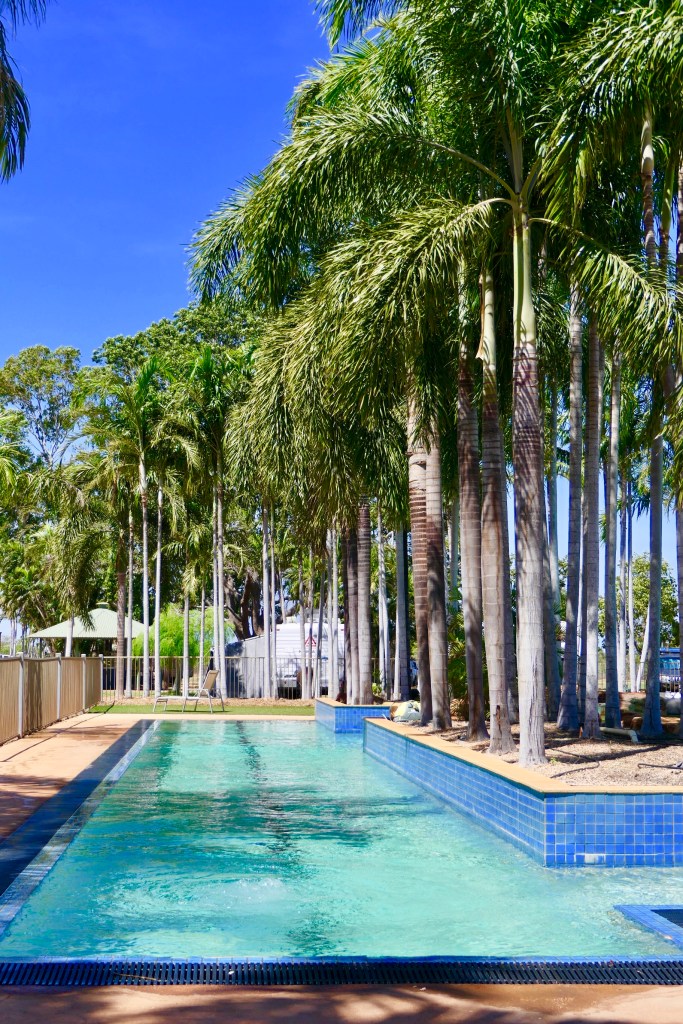 We arrived in Broome around mid-day. Lucky us, we were allocated the same big, grassy, site we had used as we passed through previously, right beside the pool, and shaded by beautiful palms.
