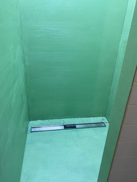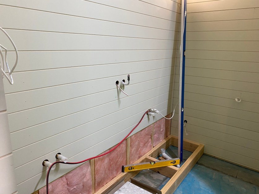 Work on the new bedroom and en-suite is well underway. The en-suite is taking shape with the shower walls up, some of the bathroom wall panelling fitted, and the pre-plumbing fit out completed. Paul spent much of today applying the green water proof coating to the shower walls and floor. The floor tiles will be laid tomorrow, and the shower wall tiles the following day. The vanity cabinet has been ordered with delivery expected next week.