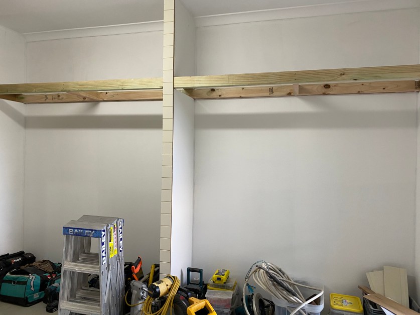 The wardrobe framework is up. Unfortunately we couldn’t fit in a good sized walk in robe, so have opted instead for two floor to ceiling fitted robes. Each robe is bigger than the one we have in our current bedroom. We’re waiting for the hardware for the sliding doors, and for the panelling to make the doors. Paul undercoated the rear of the wardrobes on the week-end.