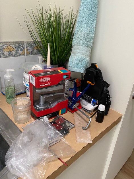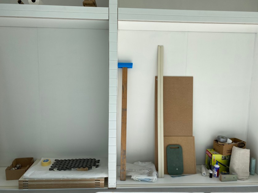 Even the kitchen bench isn’t free of clutter. In case you’re wondering why the empty cereal box is there, they slide between two walls that are being painted different colours for masking.