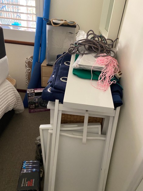 The room reserved for the clutter, one bed on top of the other with everything piled on top