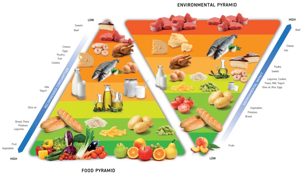 My interest had been tweaked. I decided to look a bit closer. One google search led to another, and eventually led me to the planet’s blue zones, and then led me to the Planetary diet. If the Blue Zones are old news to you, then please forgive me for having had my head buried in the sand. If you’re not aware of the blue zones, they are the areas where the general population is known for their outstanding longevity. I won’t list them, as it’s easy to look them up. The blue zones are, as you can imagine, often a hot topic for dietary researchers. I gather the EAT – Lancet Commission looked closely at the blue zones when developing their Planetary diet. So what is this Planetary diet? Start by taking a look at this double food pyramid.