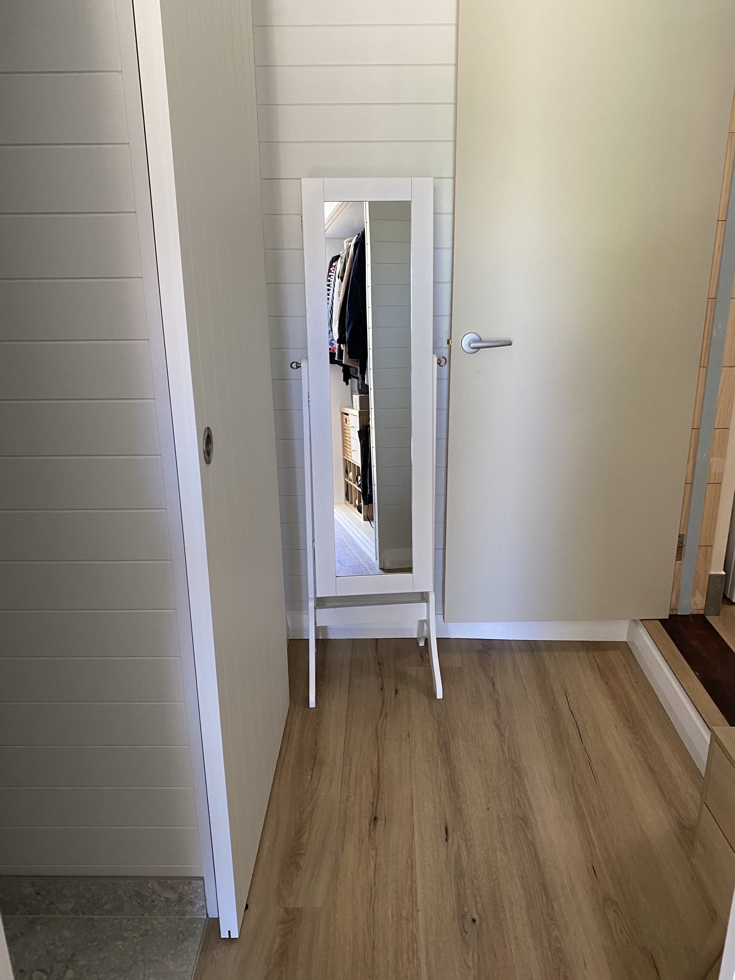 The old garage used to have a shoppers entrance leading into the laundry. We’ve changed the direction of the new door so as it now opens into the new bedroom. The door, and it’s new framework are still to be painted, but Paul is currently suffering from painters arm. Next week, or maybe next year – it’s not going anywhere! The entrance leads to a little entrance hall with hooks for hats, or jackets, or dressing gowns. We found a great little jewellery cabinet on line with a full length mirrored door. It’s perfect in the entrance, and I found jewellery I’d forgotten I had when transferring everything from a small jewellery box into the cabinet.