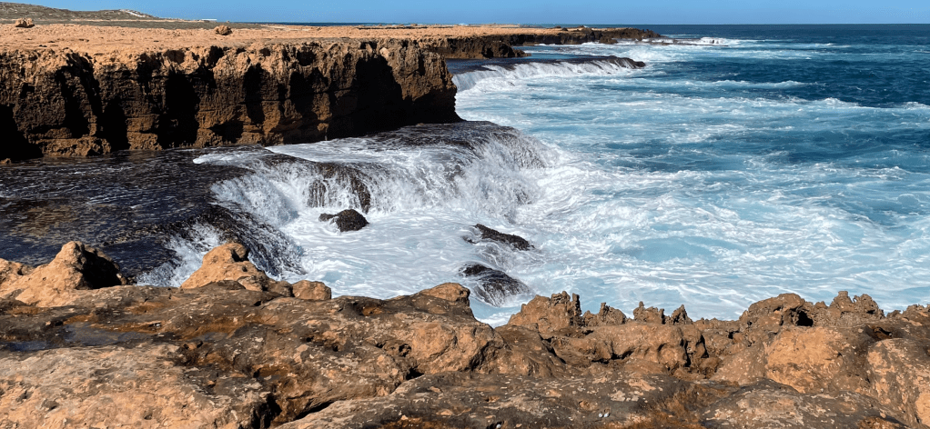 It was Paul’s milestone birthday, a good opportunity to pack a picnic lunch and go exploring. Approximately 70 kms north of Carnarvon there’s a spectacular piece of coastline with small holes in the rocky shore through which the water from the crashing waves is forced upwards. The place is aptly named, The Blowholes. Whilst the Blowholes are exhilarating to watch, it’s the rugged coastline to which the waves crash, and then wash back into the sea that I love best.