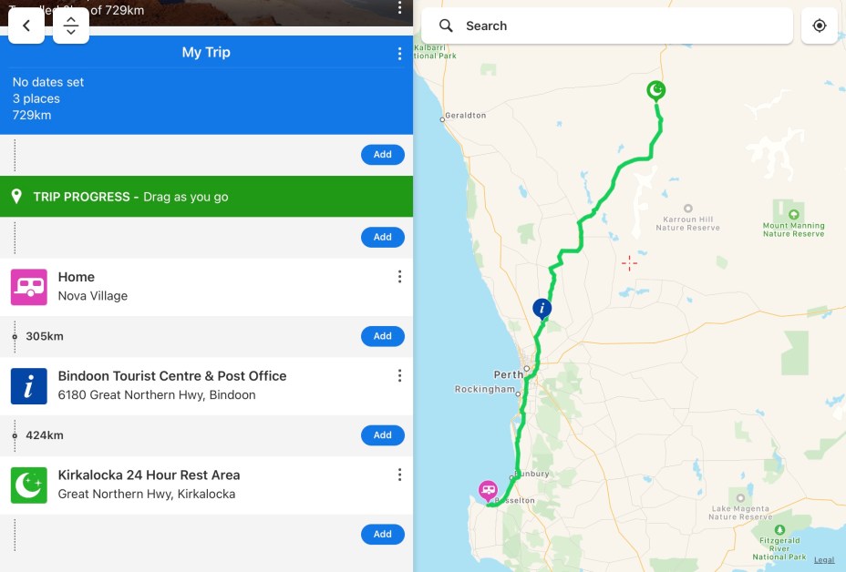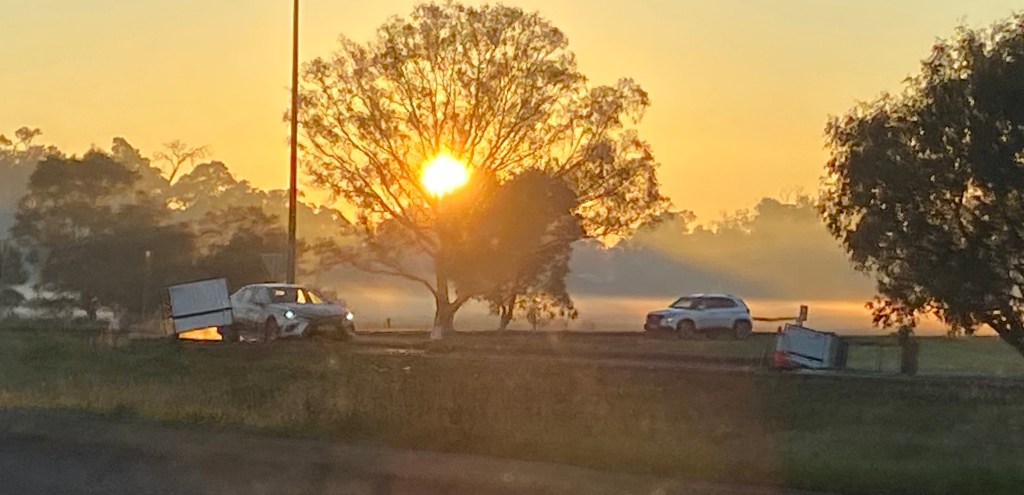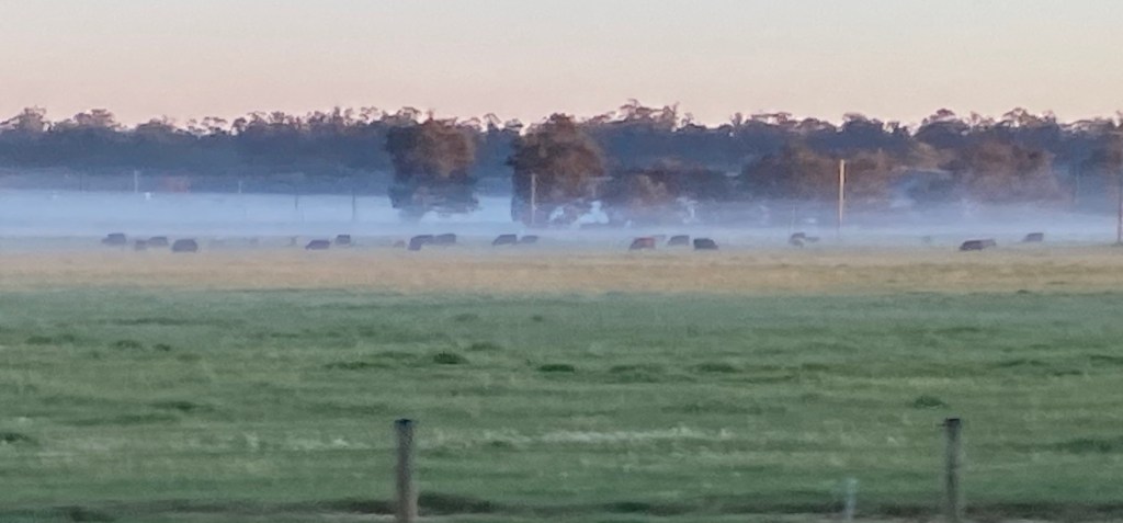 A long driving day today, 729 kms. We left at 6.50am just as the sun was rising. Mist lay low in the fields to our left from Busselton through to Bunbury. To our right the sun was rising, but still low in the sky, flashing through the trees like a strobe light.