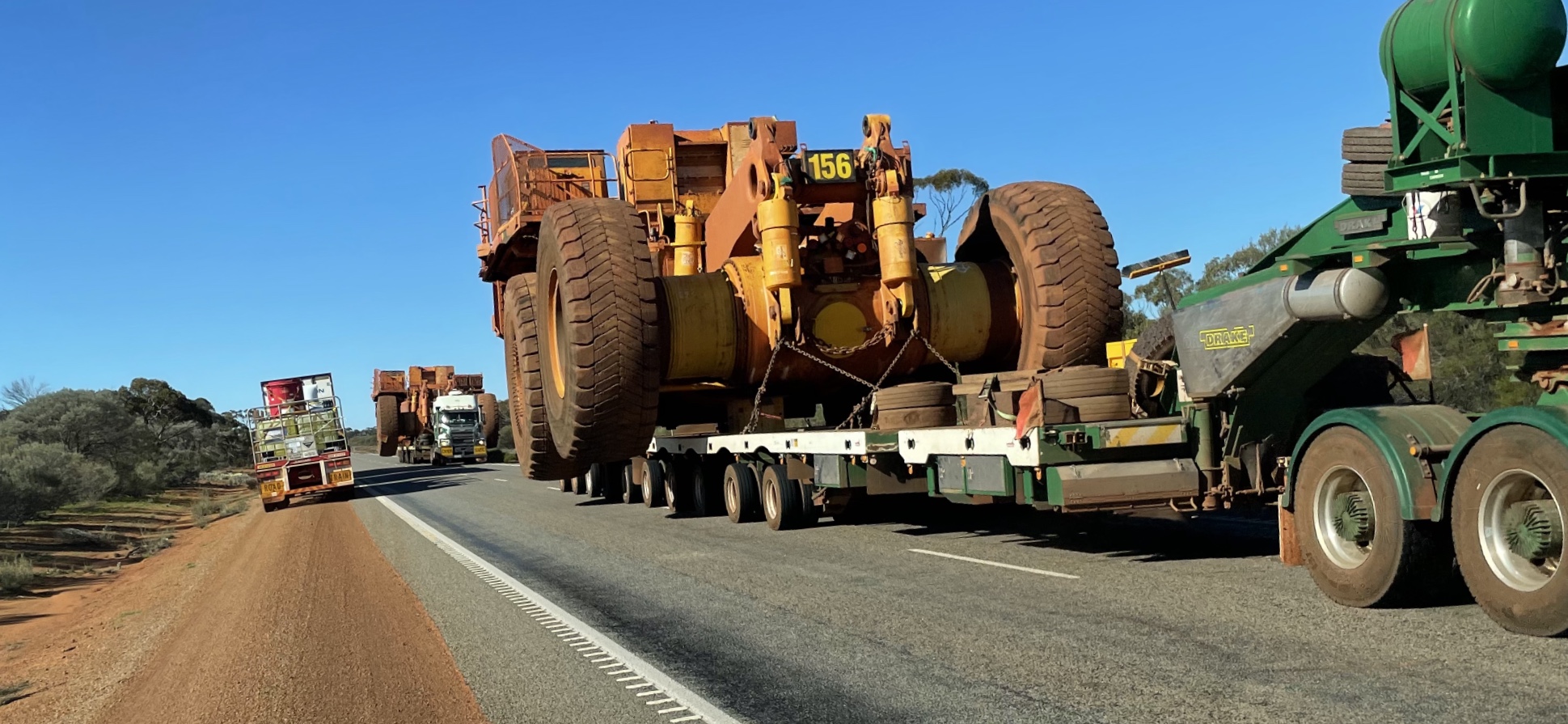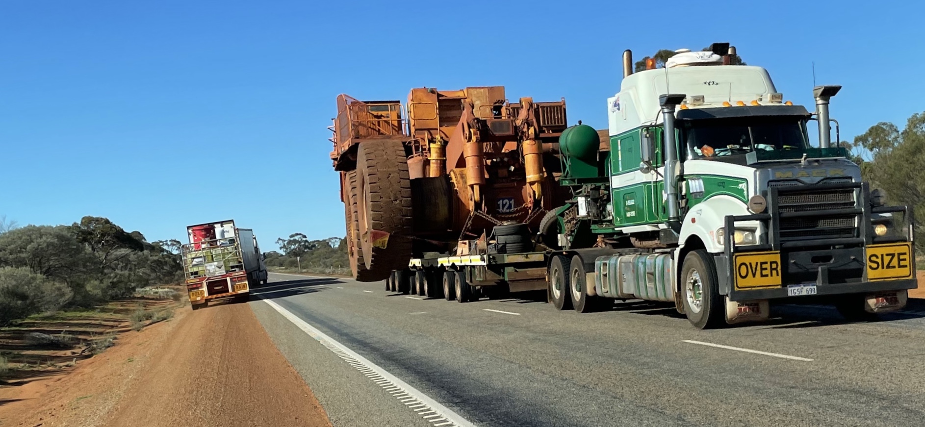 Another support vehicle, this time coming towards us, signals for the road train in front of us, and for us to move to the verge and stop. A police vehicle follows to ensure we’ve understood. As the massive loads approach we’re only to happy to oblige. The road train in front of us on the verge was notably large, yet it looks like a matchbox toy compared to these beauties.