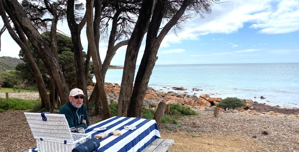 We moved around to the adjoining Gannet Rock bay where there’s a picnic table to have our lunch. Gannet Rock is only about 1/2 kilometre from Point Picquet anyway, so close enough to get back there quickly if a Blue came through, or if a Humpback came close to shore and started breaching.