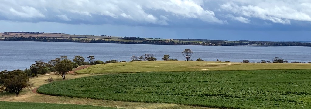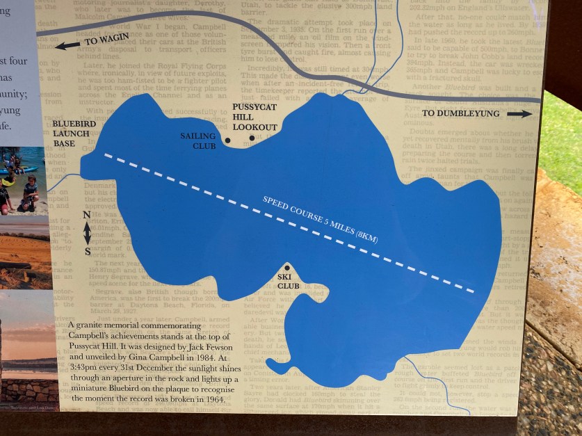 There’s a little interpretive museum in town where a 20 minute movie tells the story, and it’s well worth taking the time to watch it. It’s also worth the short drive out of town to see Lake Dumbleyung, well it was worth it for us, and it was certainly worth it for Donald Campbell. The Lake is mostly dry, but this year it was full due to our heavy winter rains. It’s huge, so hard to imagine it can ever completely dry up.