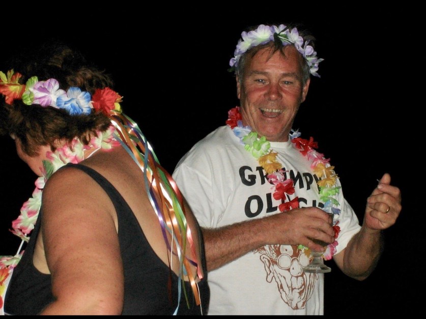 With young families and new mortgages, money was short. Our entertainment was neighbourhood based – dinners, cards, and other silly games. One of my earliest memories of the six of us was one of those silly games played along the lines of musical chairs, but with a difference. A box of clothing was put into the centre of the room, panty hose, hats, knickers, bras, scarves, anything at all…. The music played, and each couple danced around the room but weren’t allowed to dance close together. When the music stopped a mad scramble took place as couples scrambled to reach each other so as to be able to drop to the floor together. The last couple to drop was required to reach into the box and don whatever item of clothing they extracted (over their street clothes of course). The following photo is the earliest one I have of Bob. He and Terry fell over in their scramble to reach their wives. That sort of madness and laughter has continued on for nearly forty years.
