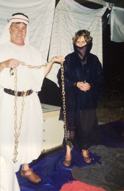 Special birthday’s were often celebrated with themed birthday partys. Marina celebrated one of her milestone birthdays with an Arabian theme. Bob entered in his shiek’s costume with Dianne firmly tethered to him with a chain and leg cuff.
