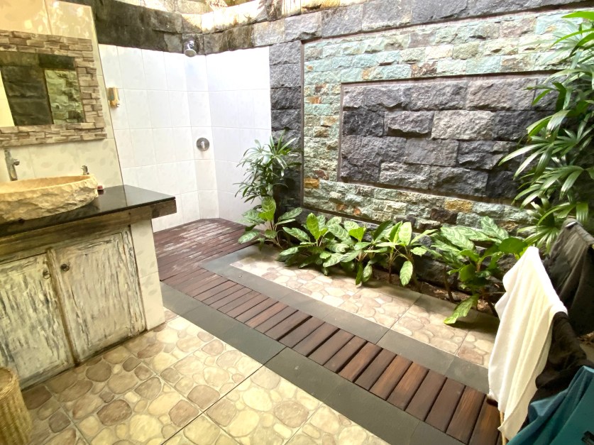 The hut has a beachy, white washed decor and is tucked away into a secluded little corner overlooking the pool. The structure isn’t lined, so there are gaps between the boards – a few ants run around over the dressing table, and I think to myself, ‘I hope nothing really nasty finds its way inside from between those gaps.’ The covered verandah is comfortably furnished with an outdoor lounge suite and coffee table.