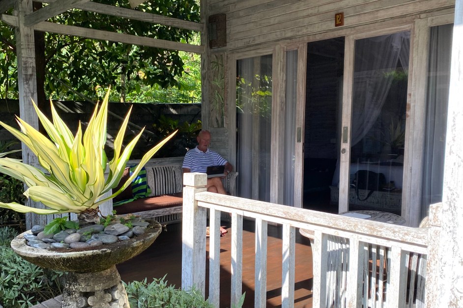 We were met by a driver and taken to our accommodation at Palm Grove Huts on Mushroom Bay. We had arrived a bit early so left our packs at reception and went to the on site restaurant for coffee. It was just after 11, so breakfast had finished, and lunch not yet started. Clearly this establishment was a giant step down from our Sanur accommodation with its all day dining, but at approximately 1/4 of the price I’m reminded that you get what you pay for. As there was no all day dining, we managed to get ourselves only a cup of coffee, there were no snacks to accompany it. We drank our coffee, went for a short orientation walk around the immediate neighbourhood, made an appointment for a massage, and went back to check out our accommodation.
