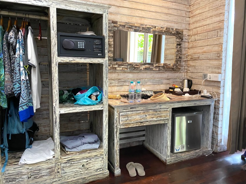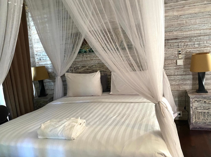 Inside, the air conditioned room is furnished with a mosquito net covered king sized bed made up with with clean white linen. We also have a day bed in the room, an open wardrobe, dressing table, a TV, and a few other bits, certainly enough to ensure we’ll be comfortable for the next few days and nights.