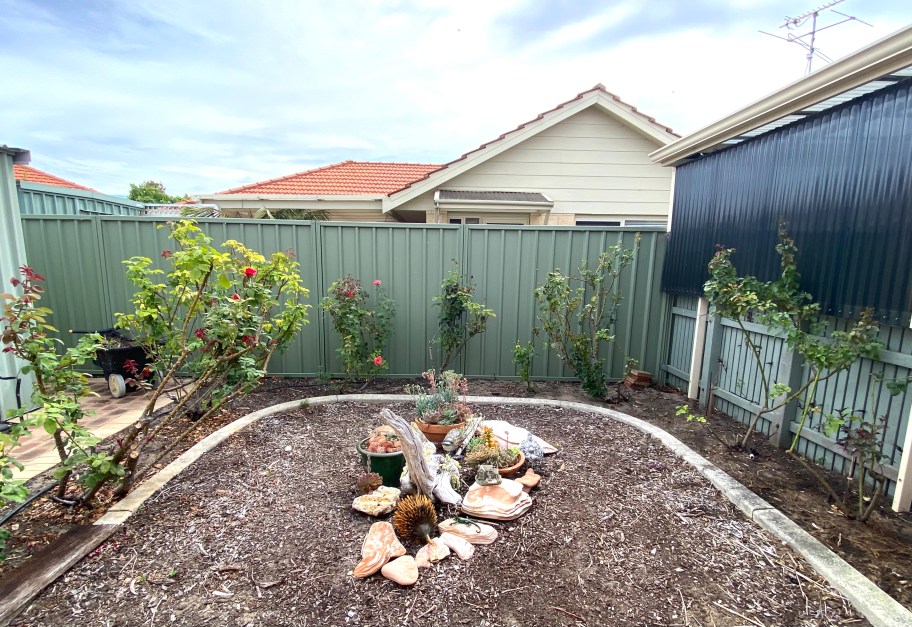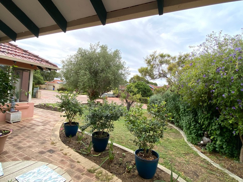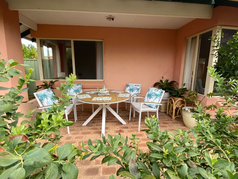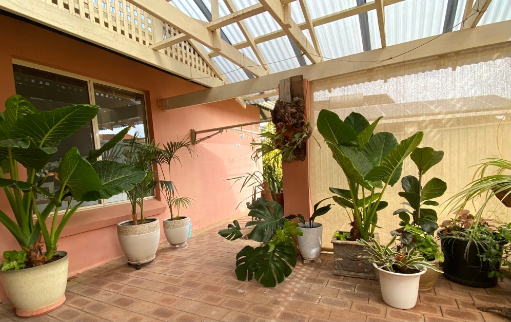 The rose garden is adjacent to what is supposed to be the alfresco area. The air conditioning unit is in the alfresco area, and it gets the hot afternoon sun from the West, so we’ve chosen a verandah at the front of the house on the north east corner for our outdoor area. The dedicated alfresco to the west makes a good shade house though for my shade loving pot plants.
