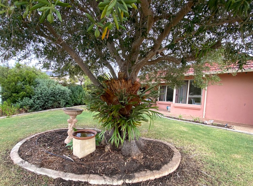 We’ve done a lot of work this week in the front garden to the north. All of the gardens were choked full of couch grass. It’s been hard work to get all the dead plants and the couch grass out, but I think we’ve broken the back of it. From now on we should be able to keep on top of it. We’ve rescued some almost dead agapanthus and have dotted them around the garden beds, and have added some white vincas, and blue salvias. In a month or so I imagine they’ll start to put on a bit of a display. Our potted blueberries have found a temporary home in front of our outdoor table and are helping to fill the gap until the plants start to thrive. There’s a lovely mature olive tree in the front garden with a mass of Elk Horn Ferns attached. The Elk ferns were almost dead when we arrived, but they’re starting to look good now.