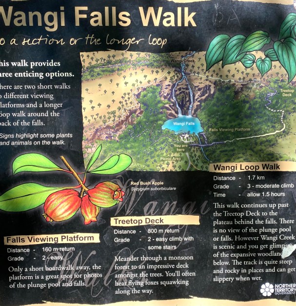 Today we chose the Wangi Falls walk. It was graded as a moderate walk of around an hour, and true to its description, it was in fact only a moderate walk, and it did only take approximately an hour. The walk starts at the Wangi plunge pool and water falls, and then meanders up and around the back of the falls in a circuit finishing back at the swimming hole. It’s a steep walk in places, but it’s not to difficult for a couple of old ducks like us. Mind you, Paul is a bit of a mountain goat, I definitely am not. I’m okay going up hill and can hold my own, but when it comes to the downhill sections I take my time and pick my way carefully.