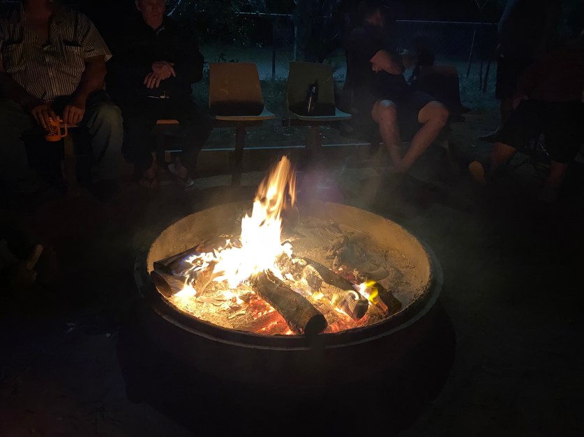 There’s a cafe on site, as well as a few basic supplies for campers. From all of the WIKI reviews the Angus beef burgers are up there with the best. We purchased two yummy vanilla slices for our afternoon tea, and ordered two beef burgers for dinner, which Rick and his two children, Riley and Ali, personally delivered to our caravan. They were absolutely delicious. We’d spied a communal pit earlier in the day so we wandered over for the evening to join the other travellers. It’s always nice to sit around a fire pit and swap a few yarns and travel tips with fellow travellers.