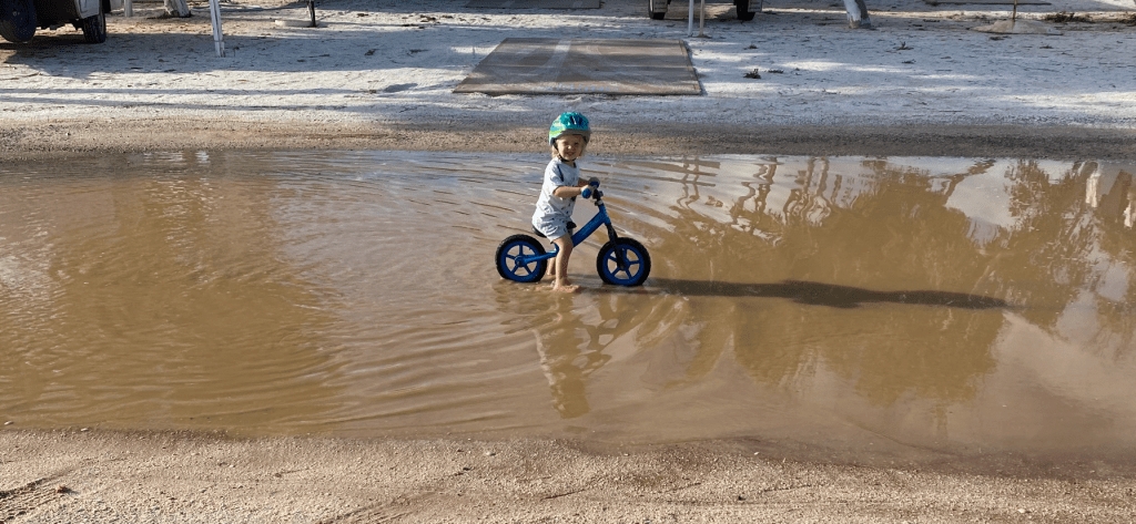 We’ve checked out some local fishing spots, and will try our luck tomorrow. In the meantime thought I’d leave you with this cute little photo a young child making the most of the sunshine on the flooded caravan roadway.