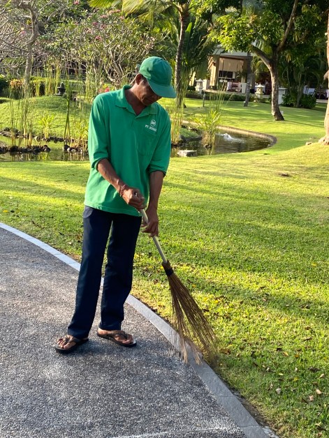 Oh and before I close – here’s a snap of one of the early morning groundsmen in our hotel. Note the broom he’s sweeping the lawn with.