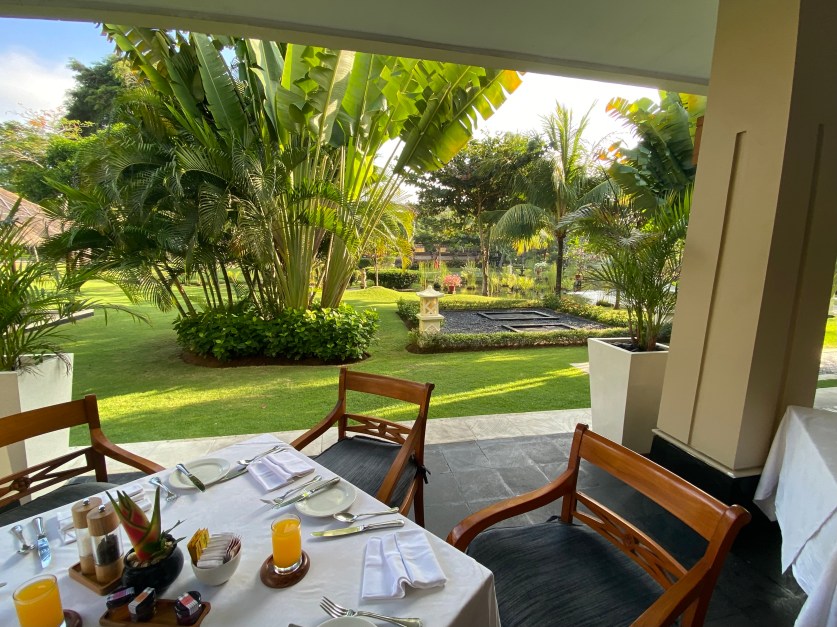 From our breakfast room we look out onto a wide expanse of green lawns, fringed with tall bamboo, and with the tinkle of fountains in the landscaped central lake. It’s so serene. Just gorgeous.