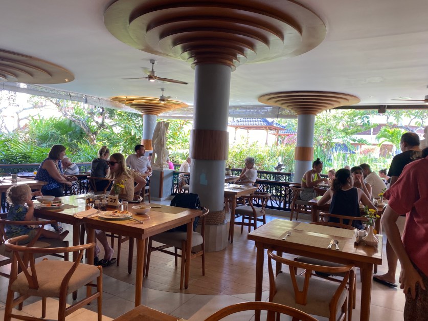 However for the fifth member of our party the first three days of this, her first, trip to Bali created a somewhat distorted view of this little tourist haven. Having booked a Lagoon Palace Club room for each of us at the Nusa Dua Beach Hotel and Spa, we have spacious rooms in a quiet and peaceful part of a lovely Balinese style hotel. Our dining is relaxed and peaceful, our rooms well serviced, and the pool adjoining our rooms is used by 16 rooms in total only. Consequently we’re shielded from the crowds inside our hotel, and with the hotel being in Nusa Dua, we’re also shielded from any of the normal hustle and bustle evident in other areas of Bali when we venture outside into the adjoining neighbourhood.