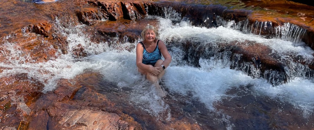 Today we chose the Wangi Falls walk. It was graded as a moderate walk of around an hour, and true to its description, it was in fact only a moderate walk, and it did only take approximately an hour. The walk starts at the Wangi plunge pool and water falls, and then meanders up and around the back of the falls in a circuit finishing back at the swimming hole. It’s a steep walk in places, but it’s not to difficult for a couple of old ducks like us. Mind you, Paul is a bit of a mountain goat, I definitely am not. I’m okay going up hill and can hold my own, but when it comes to the downhill sections I take my time and pick my way carefully.