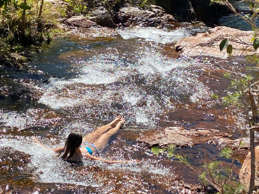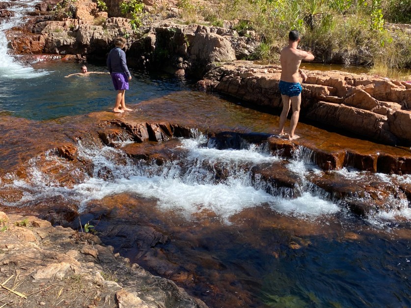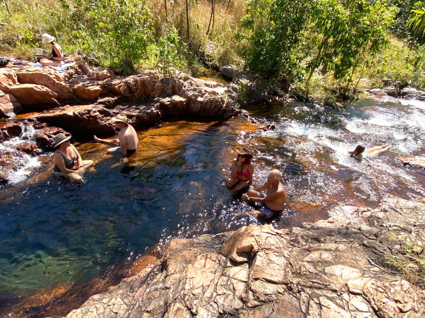The lower pool was the quietest of them all. At first we were reluctant to venture into the connecting waterways between the pools, fearing crocs could be lurking in those narrower, rocky areas. However, it didn’t take us long to lose our fears as we saw others venturing into the more secluded, connecting streams. The rangers do a pretty good job of monitoring for dangerous predators and have all sorts of traps, and warning devices for any Salties (Estuarine Crocodiles) that may venture into the swimming areas earmarked for safe public swimming. Please note, these areas are not considered safe during the wet season, and the swimming areas are generally kept closed. I would never venture into any of the water holes during the dry, or the wet season though until at least mid-morning after I know the rangers have had a chance to check things out, and there are at least a few other people in the water. There’s no way I want to be the only main course on offer for any big croc that’s lost his or her way in the water ways. At least if one has managed to evade all the warning devices, I can at least hope that I’m one of the less appetising courses on offer in a smorgasbord of swimmers.