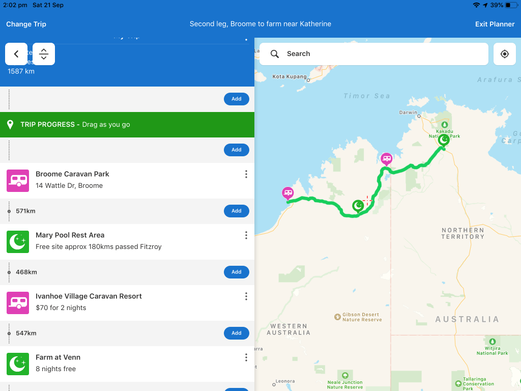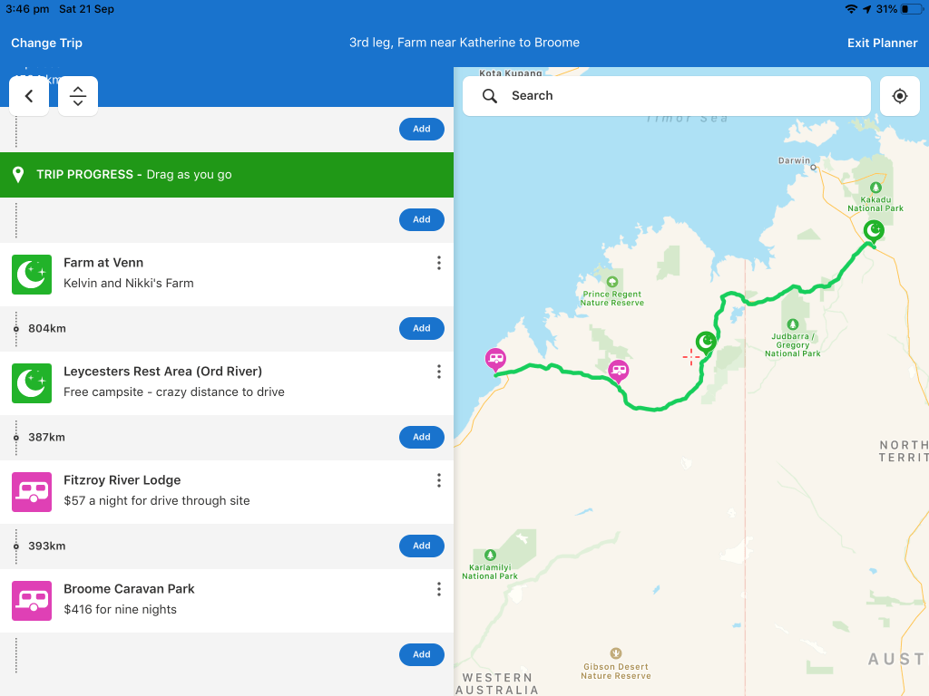 This has become both our favourite first, and favourite last stop on our trips to and from the north of our country. It skirts the city of Perth and seems to get us on the way quickly. See the map below for the full travel plan of overnight stops: