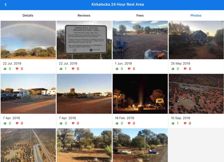So, how do we pick an overnight stops. We look at all the available destinations on Wiki camps, and by clicking on them we find what is available there, and how many stars the place has earned from independent travellers, people just like us who are travelling the roads. I’ve used Kirkalocka as an example below. You’ll see that the first thing that pops up when clicking on Kirkalocka is the facilities available there. (We have previously marked Kirkalocka as a favourite – hence the heart)