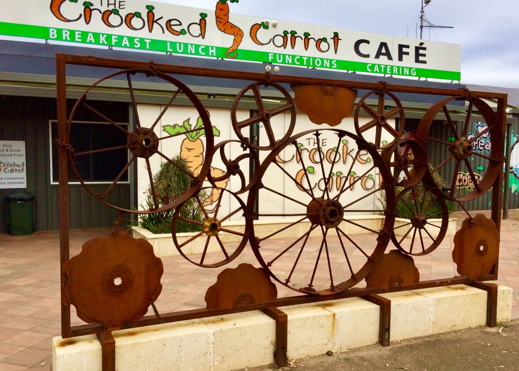Most definitely a quirky little eatery The Crooked Carrot is located approximately 35 kms from Bunbury on the corner of Rigg Road and Forrest Highway, in Myalup, in the South West of WA. It opens at 6.30am for breakfast, and stays open until 4pm, seven days a week.
