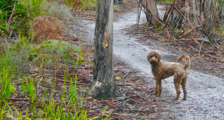 Perfect tracks for dogs to walk“come on you two”, he waits patiently for us to catch upLots for dogs (and people) to look atFlowers planted around the camping areawith interesting pots for the colourful plantsTall trees to walk underOne of several dams to walk aroundSuch a peaceful setting – note the table and seat in the distance, one of several dotted around for campers to find a quiet place and enjoy the peaceful sounds of the bush